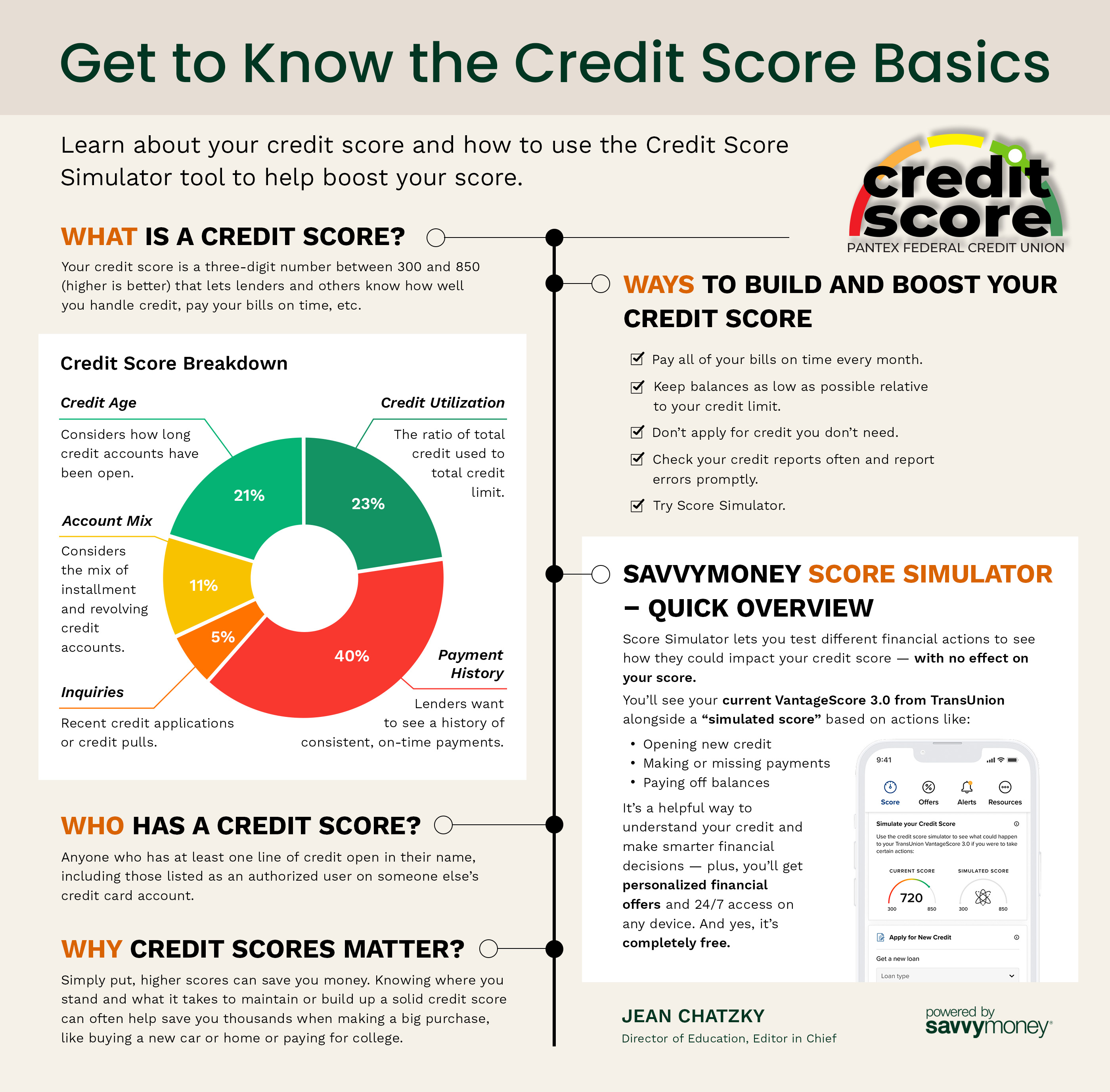 At Pantex Federal Credit Union, we’re excited to offer Credit Score—a free tool within online and mobile banking that helps you take control of your financial health. With Credit Score, you can check your credit score, review your full credit report, set up custom alerts, run “what-if” simulations, and even monitor for signs of identity theft. Plus, you’ll gain access to expert articles with practical tips on managing credit and debt wisely.